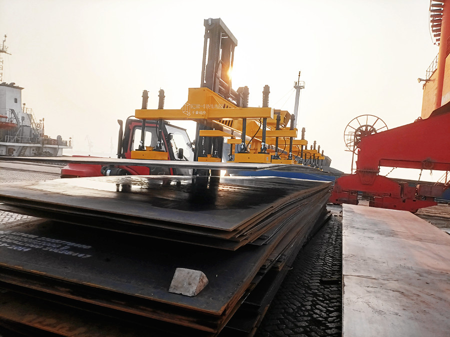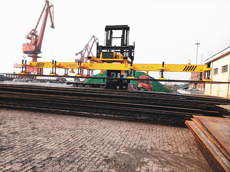 此款磁力吊具用在港口配合叉車使用吊運(yùn)長鋼板。本套充電式鋼板起重吊具采用12組電永磁起重器聯(lián)吊??蓪?shí)現(xiàn)單張鋼板max重量為4噸、厚度8mm、10mm、12mm鋼板一次搬運(yùn)二張平穩(wěn)運(yùn)行。厚度14mm、16mm鋼板一次搬運(yùn)一張平穩(wěn)運(yùn)行。
