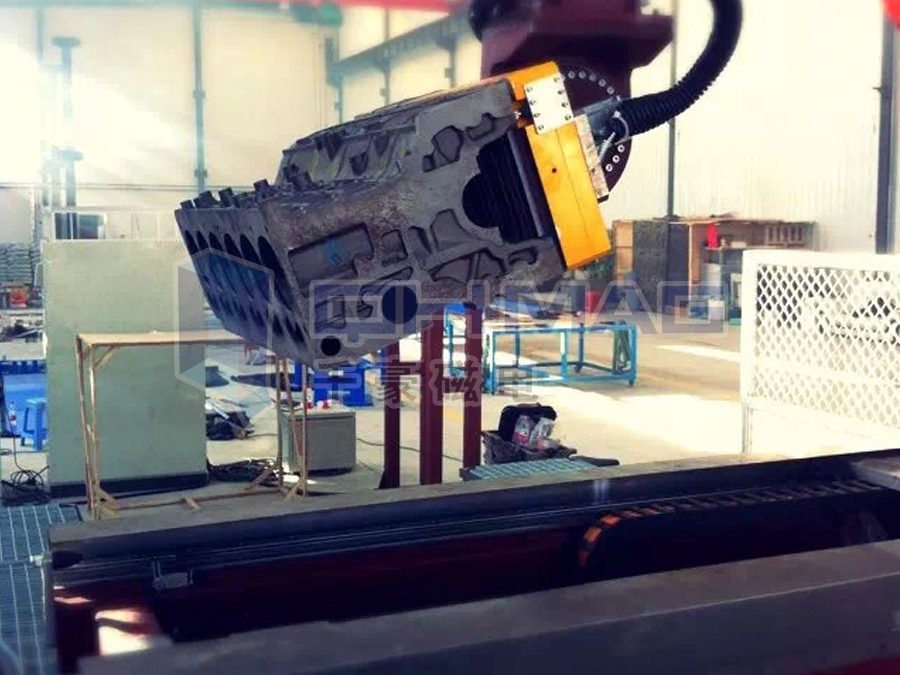 電永磁吸盤吸附汽車發(fā)動機缸體搬運。(合作客戶實拍,未經(jīng)允許,不得轉(zhuǎn)載使用)