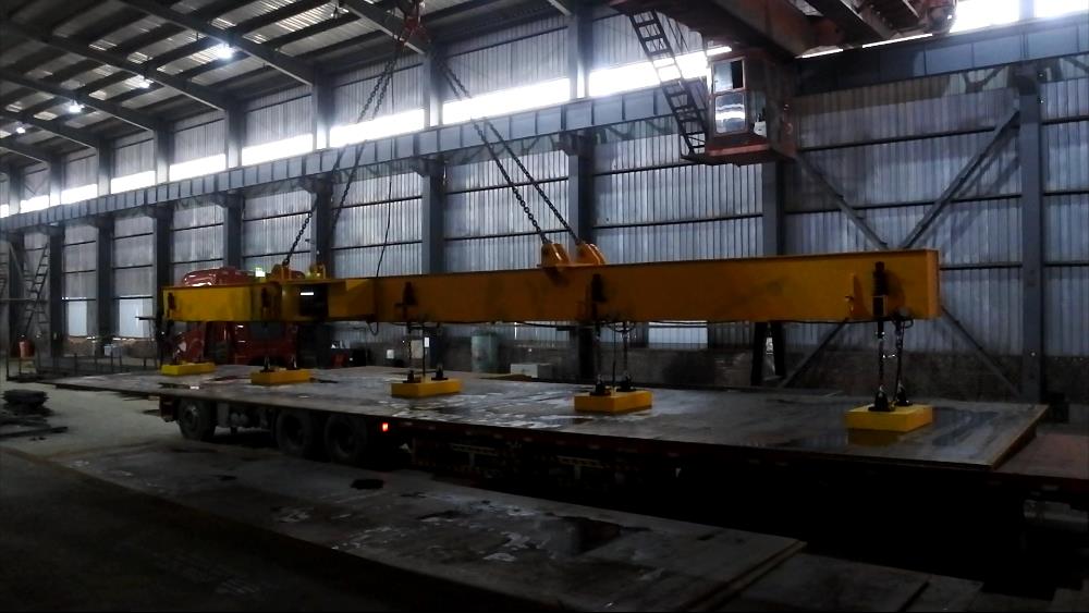 長鋼板吊運可能出現(xiàn)彎曲變形而影響安全搬運,所以在吊運長尺寸鋼板時,請使用多臺